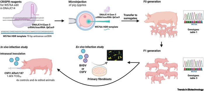 | ▲ 시험관 내 시험 후, DNAJC14의 엑손 5를 표적으로 하는 CRISPR (cr)RNA/trans-activating (tra)crRNA를 갖는 Streptococcus pyogenes Cas9(SpCas9)의 리보핵산(RNP)을 DNAJC14 단백질의 W576A 돌연변이를 인코딩하는 상동성 지향 복구(HDR) 템플릿과 함께 돼지 접합자에 미세주입했다. 약 35개의 주입된 접합자를 대리모의 자궁각으로 이식하여(표 1) 임신을 확립했다. 출생 후, F0 새끼 돼지는 교배를 위해 동물을 선택하기 전에 귀 생검에서 추출한 DNA를 사용하여 유전형을 검사하여(표 2) F1 세대를 생성했다(표 3). F1 세대 동물에서 분리한 세포를 생체 외에서 고전적 돼지열병 바이러스(CSFV) 또는 소 바이러스성 설사 바이러스(BVDV) 감염 여부를 검사했다. 체외 실험 데이터는 CSFV Alfort/187 균주에 대한 동물의 저항성을 평가하기 위해 편집된 돼지 4마리와 대조군 4마리를 사용한 체내 연구로의 진행을 뒷받침했다. 그림은 BioRender(biorender.com)를 사용하여 제작되었다.(October 22, 2025 / Open access