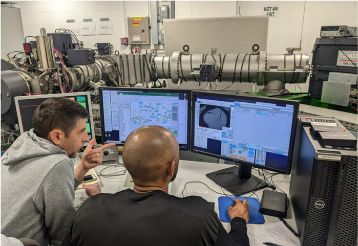 ▲ 도틴과 그의 동료 브라이언 몬텔레오네가 2차 이온 질량 분석법을 사용하여 달 샘플을 분석하고 있다. 해당 장비는 배경에서 볼 수 있다.