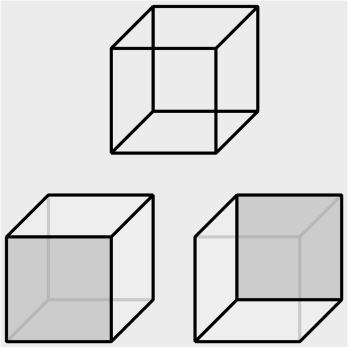 벽은 뒤에 있을까요, 앞에 있을까요?모호성은 이미지의 공간적 해석과도 관련이 있다. 네커(Necker) 큐브는 이러한 모호성의 대표적인 예다. 우리는 교차하는 사각형들을 큐브의 앞면 또는 뒷면으로 볼 수 있다. 이로 인해 우리는 큐브를 위에서 또는 아래에서 비스듬히 보는 것처럼 보이게 된다. 공간적 방향은 명확하게 정의되지 않는다. 이로 인해 우리의 관점이 바뀌고, 큐브는 마치 공간에서 뛰어오르는 것처럼 보인다.