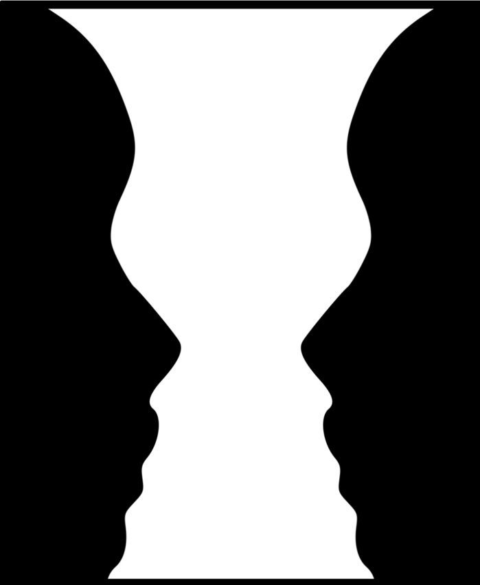 이러한 전형적인 예가 루빈(Rubin)의 꽃병이다. 이 꽃병은 검은색 배경에 흰색 꽃병을 묘사하고 있다. 아니면 서로를 바라보는 두 명의 검은색 얼굴을 보고 있는 것일까? 이 "인물-배경 이미지"에서는 두 가지 규칙이 서로 충돌한다. 우리의 뇌는 이 두 가지 규칙을 사용해 우리가 보는 것을 구조화하고 배경인지 물체인지 분류한다. 바로 대칭과 근접성이다. 이미지에서 이러한 규칙들이 서로 모순되는 것처럼 보일 때, 우리는 무엇을 배경으로 인식해야 하고 무엇을 인물로 인식해야 하는지 명확하게 구분할 수 없다.