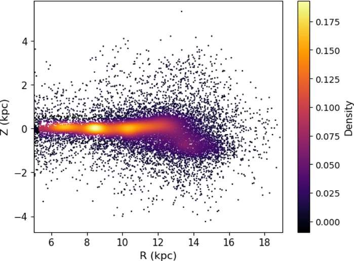 ▲ 은하 중심 반지름 R에 따른 은하 원반의 수직 단면도. 고밀도 영역은 은하의 나선팔을 측면에서 본 모습이다. 별들은 각 칸의 확률 밀도 함수에 따라 색상으로 구분되어 있으며, 이는 각 칸의 별 개수를 칸 면적당 총 별 개수로 나눈 값으로 계산된다. 여기서 칸 면적은 R에서 60pc, Z에서 30pc이다. (출처:The great wave.