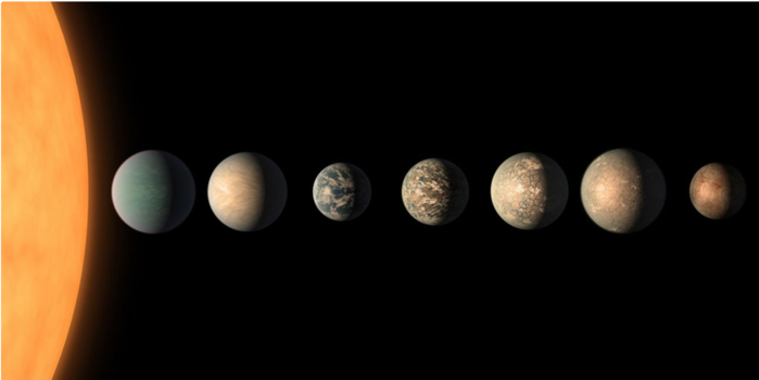 | ▲ 인근 항성 TRAPPIST-1을 공전하는 7개의 암석형 행성 중 4개가 최종 후보에 올랐다. © NASA/JPL-Caltech |